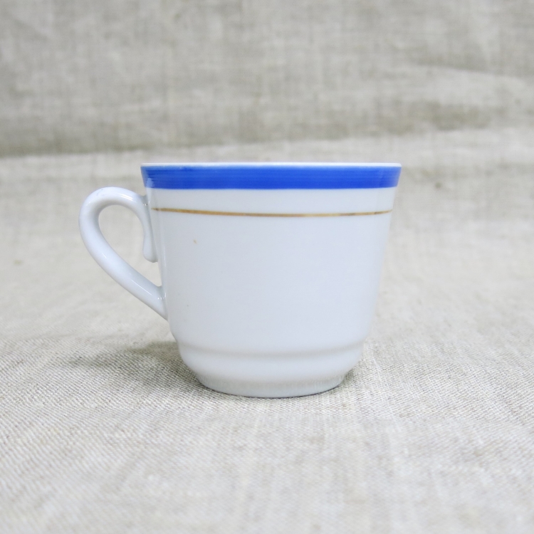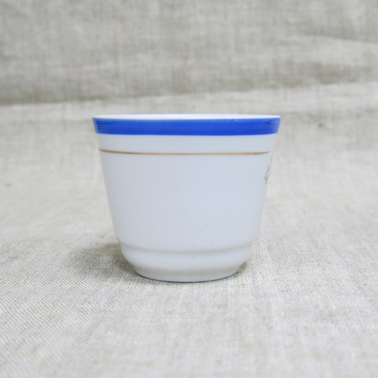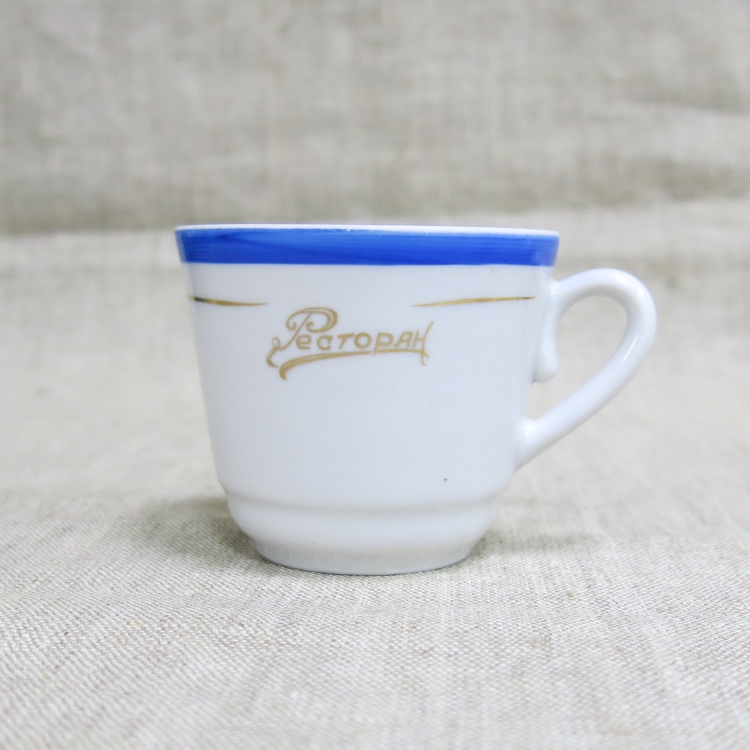 На чашке надпись золотом «Ресторан». Изготавливалась для гостиницы «Россия» в Москве, которую снесли в 2006 году для постройки парка «Зарядье».