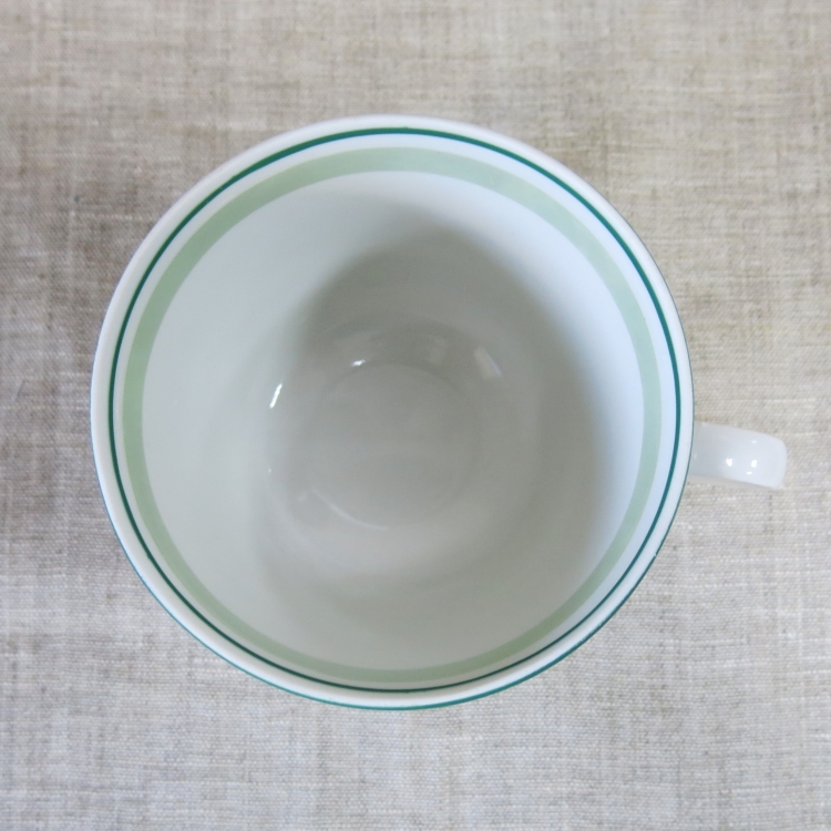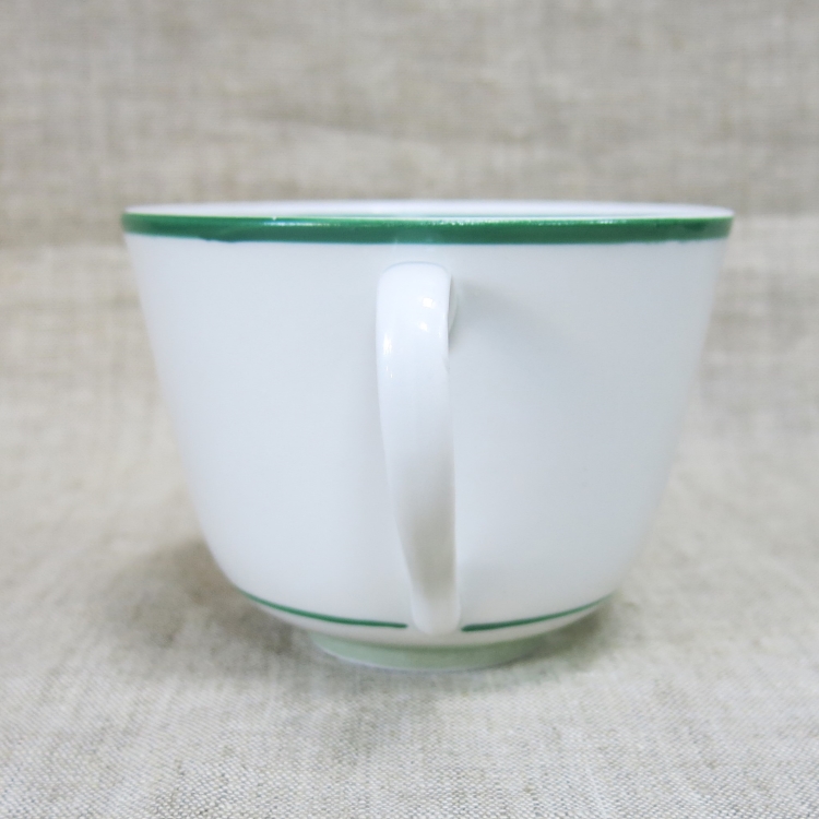 На дне чашки практически смытое зелёное надглазурное клеймо Дулёвского фарфорового завода периода 1968-2009 годов.
