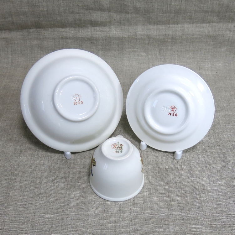 На дне чашки зелёное клеймо «ЗиК» (Конаковский фаянсовый завод им. Калинина) периода 1974-1991 гг. и красное клеймо со Знаком качества СССР и артикулом «7г12». На дне блюдца и тарелки выдавленное в тесте клеймо «ЗиК» того же периода, а также красное клеймо со Знаком качества СССР и артикулом «7г30».