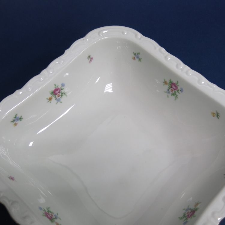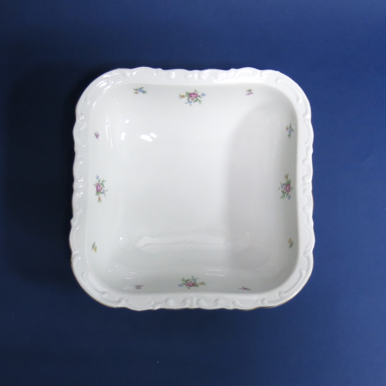 Винтажный фарфоровый салатник квадратной формы с фигурным бортом и рисунком из мелких букетов и цветов.