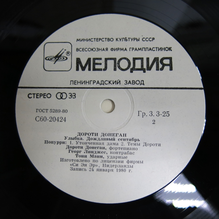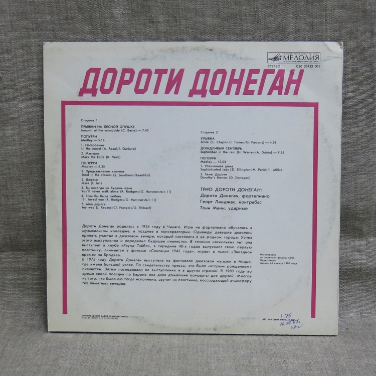 Оригинальное советское издание популярного альбома знаменитой американской джазовой пианистки Dorothy Donegan. Альбом никогда не переиздавался ни на виниле, ни в цифре. Запись 1980 года. Изготовлено по лицензии фирмы CNR, Нидерланды.