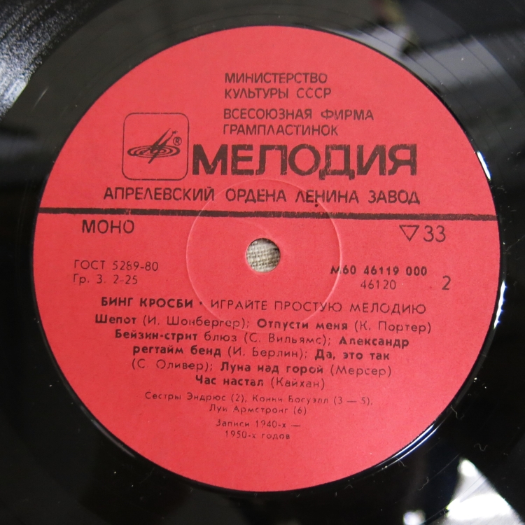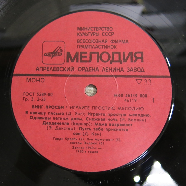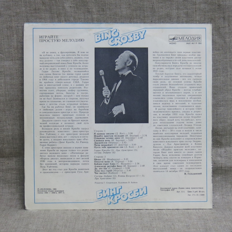 Оригинальное советское издание альбома Play A Simple Melody знаменитого американского певца Bing Crosby. Альбом никогда не переиздавался ни на виниле, ни в цифре. Записи 1940-50-х, 1977 годов.