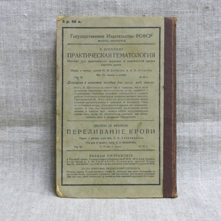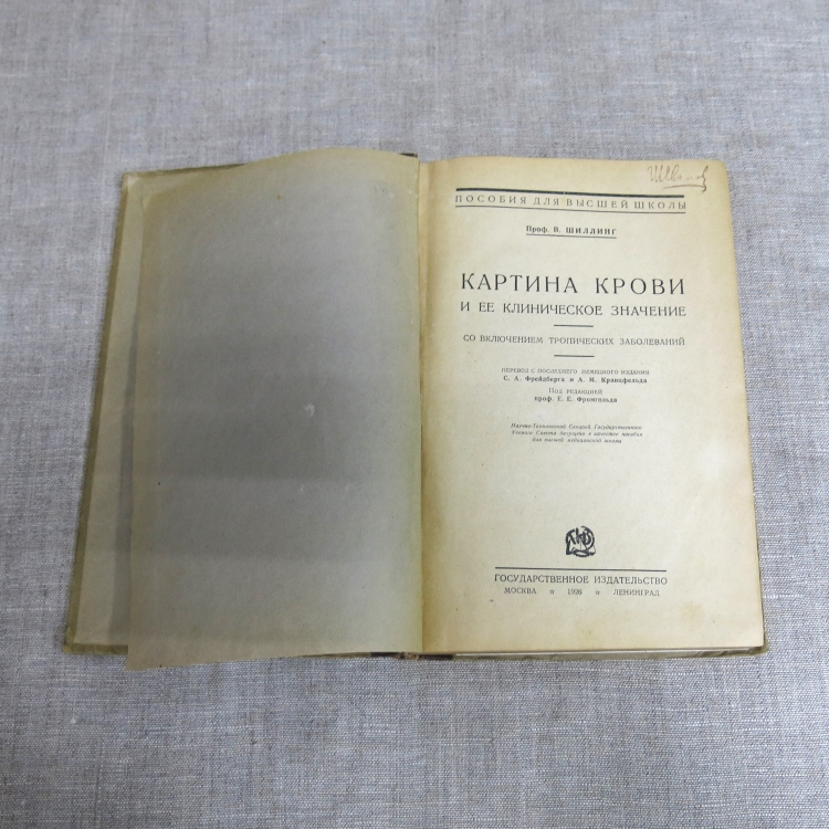 Шиллинг В. Картина крови и ее клиническое значение. Со включением тропических заболеваний. Пер. с нем. С.А.Фрейдберга и А.М.Кранцфельда. Под ред. проф. Е.Е.Фромгольда. М.-Л. Госиздат. Тираж 4000 экз. 1926 г. 368 с. + 4 вкл.цв.илл.