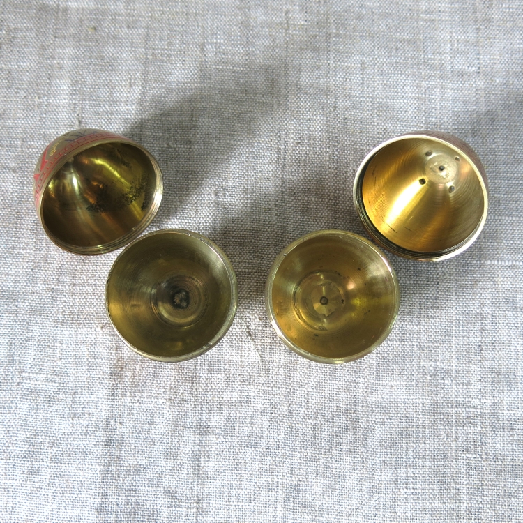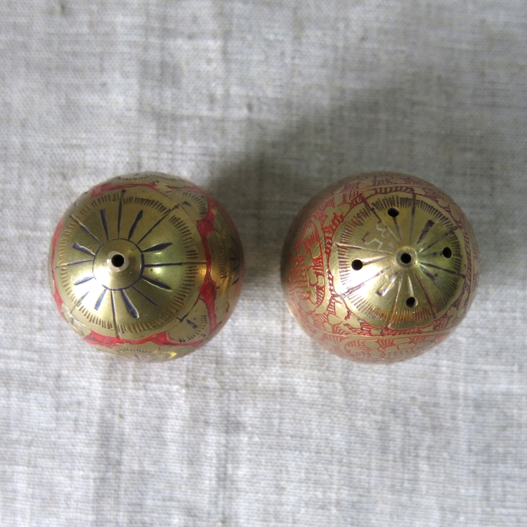 Латунные сосуды в виде яйца для соли и перца с отверстиями на макушках. Верхняя и нижняя части соединяются резьбой. Ручная гравировка штихелем, эмаль.