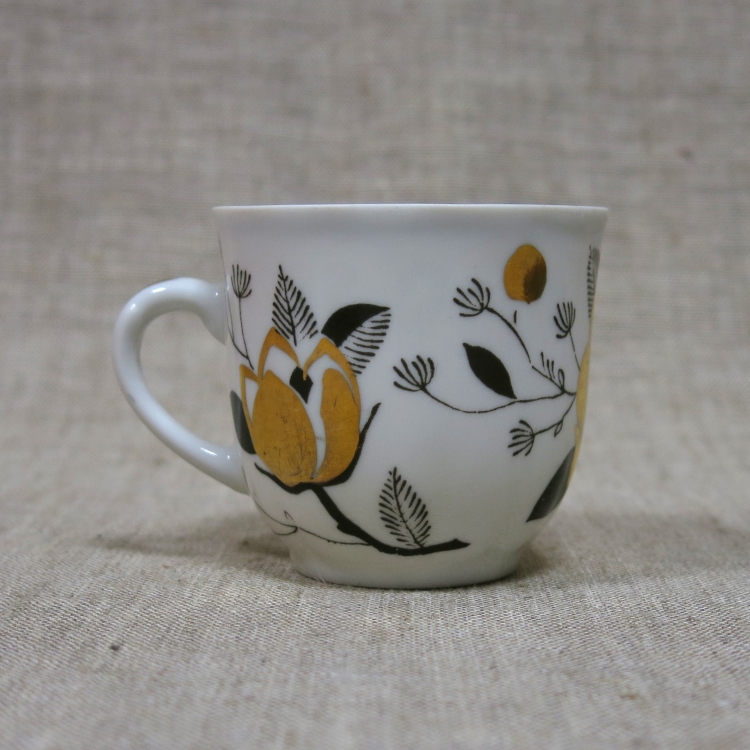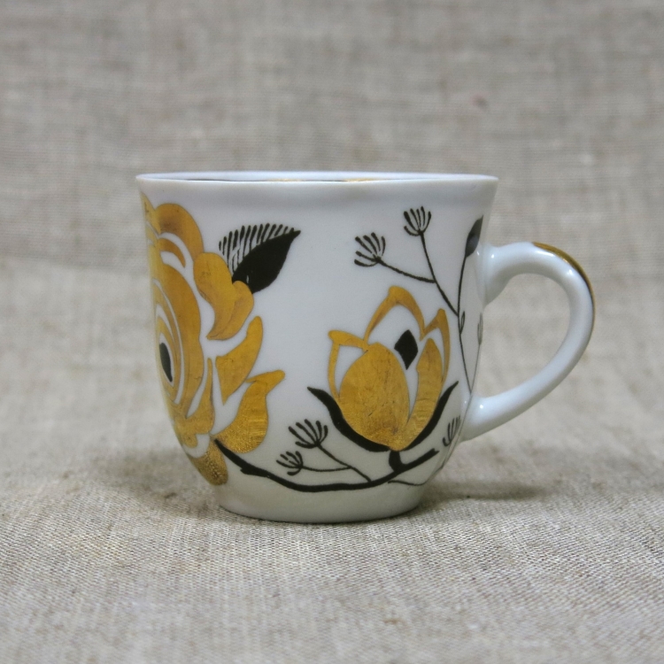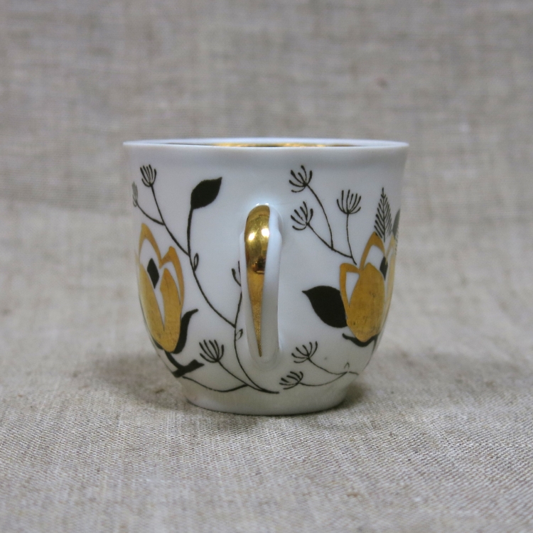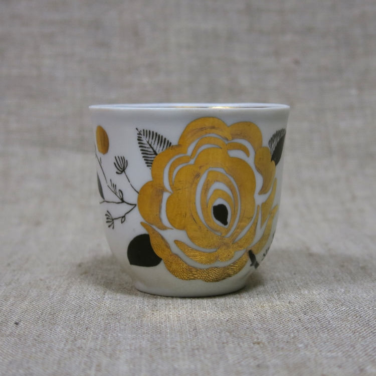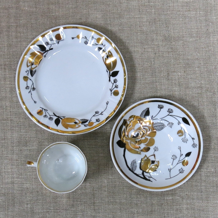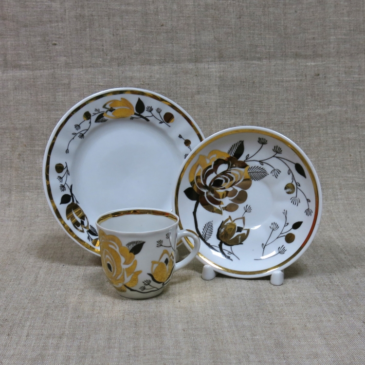 Кофейное трио (чашка, блюдце, десертная тарелка) из сервиза «Ветка» («Золотая роза»), выпускавшегося Дмитровским фарфоровым заводом в Вербилках в 1970-е годы.