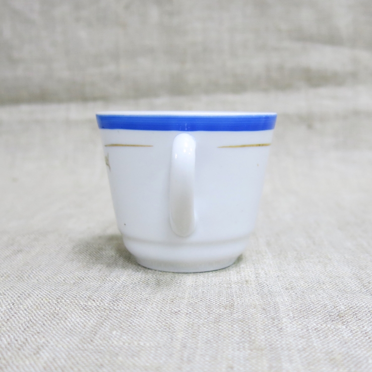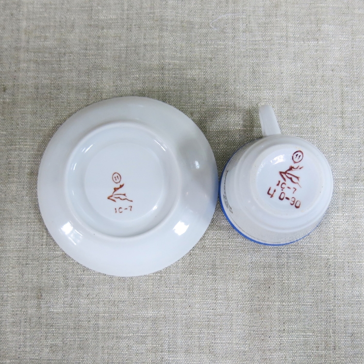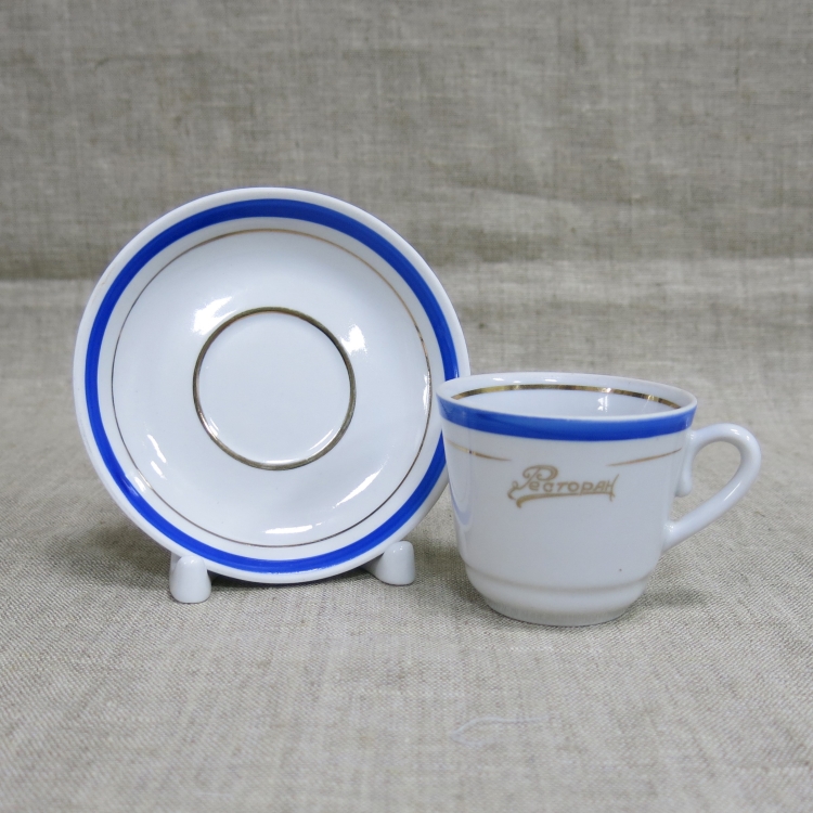 На чашке надпись золотом «Ресторан». Изготавливалась для гостиницы «Россия» в Москве, которую снесли в 2006 году для постройки парка «Зарядье».