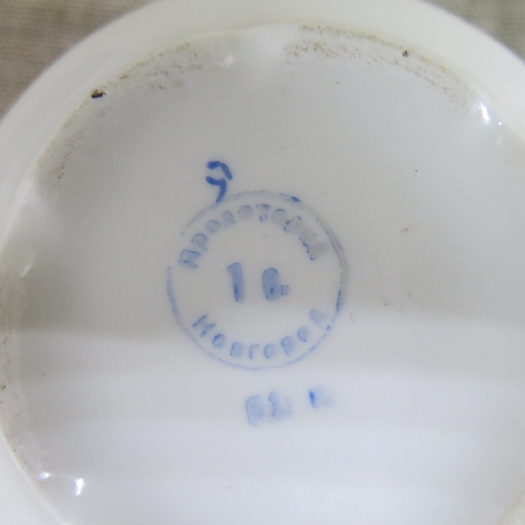 На дне чашки и блюдца синее клеймо ФЗ «Пролетарий», село Бронницы Новгородской области конца 1940-х гг.