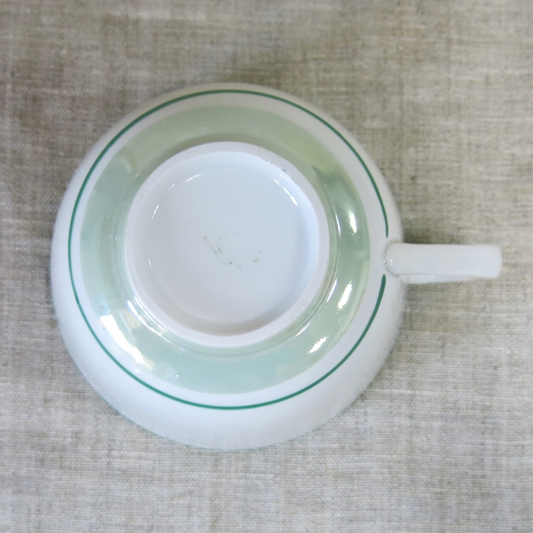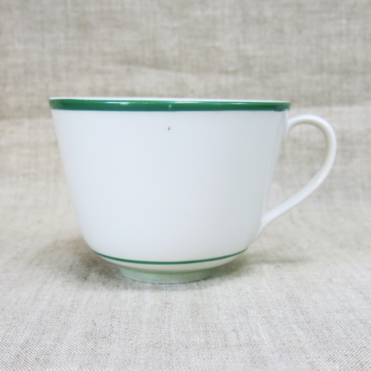 На дне чашки практически смытое зелёное надглазурное клеймо Дулёвского фарфорового завода периода 1968-2009 годов.