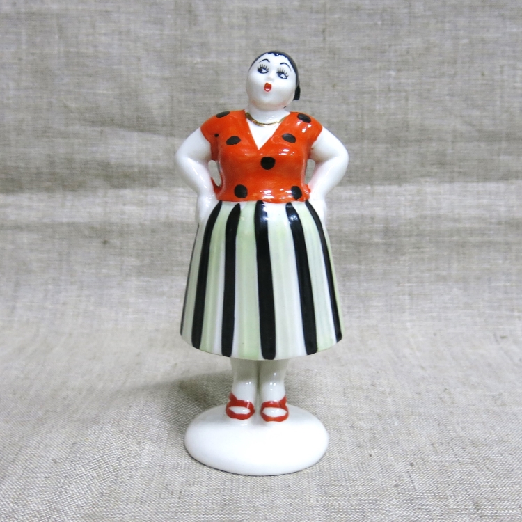 Фарфоровая статуэтка-качалка «Сплетница» («Склочница») в полосатой юбке и блузке в горошек из скульптурной серии «Разговор».