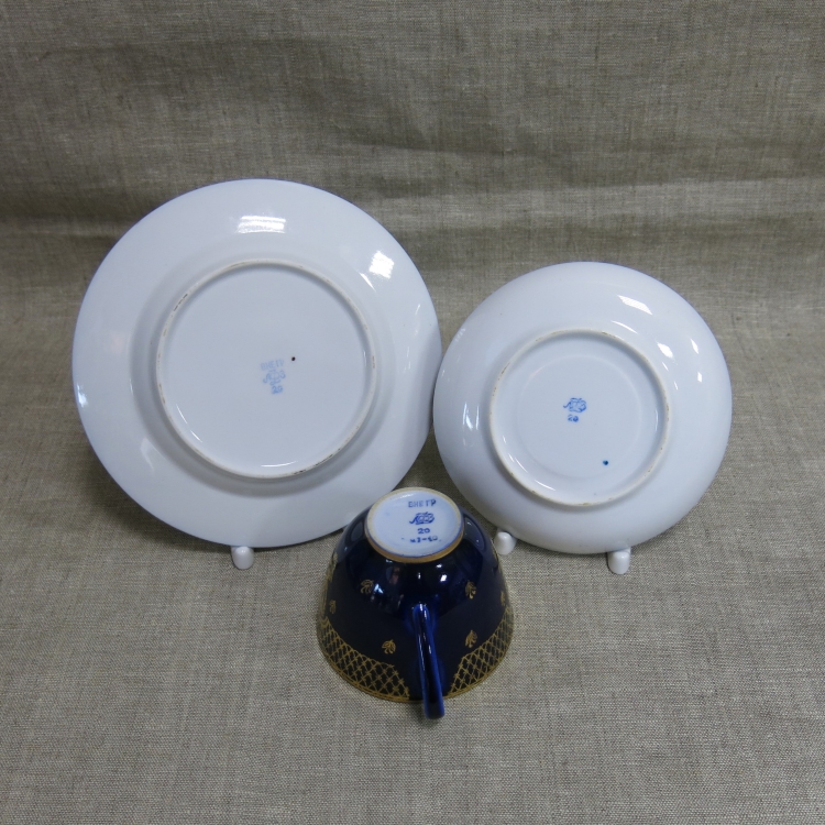 На дне предметов синие надглазурные клейма Ломоносовского фарфорового завода (ЛФЗ) периода 1970-1991 гг. с указанием группы сложности рисунка «ВНЕ ГР.», и сортности - «2с».