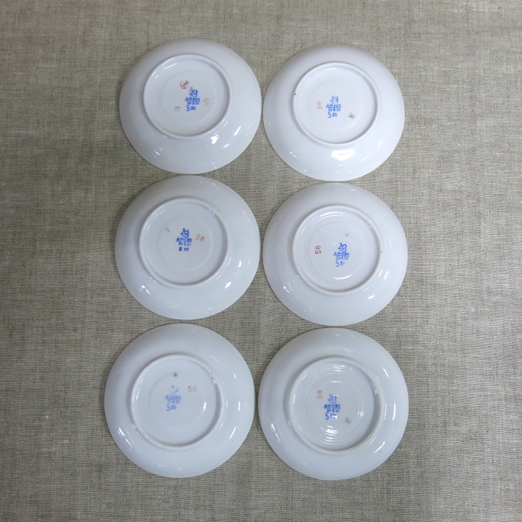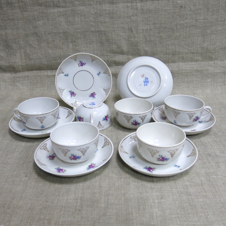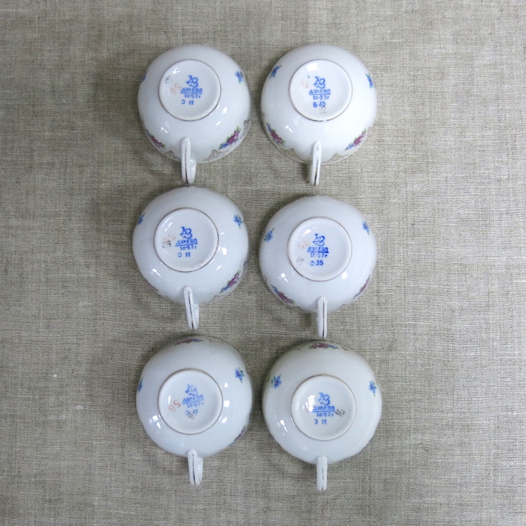 На дне чашек и блюдец синее надглазурное клеймо Дулёвского фарфорового завода: «ДЗ / Дулево / 1с-57г» и дополнительные номера.