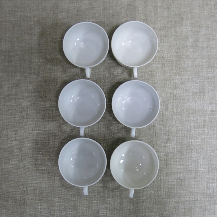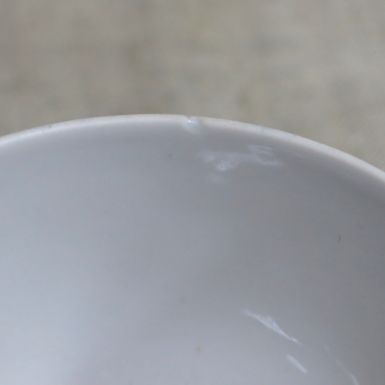 С легкими производственными дефектами и следами бытования. Без трещин. На одной чашке небольшой скол по верхнему краю (см. два последних фото).