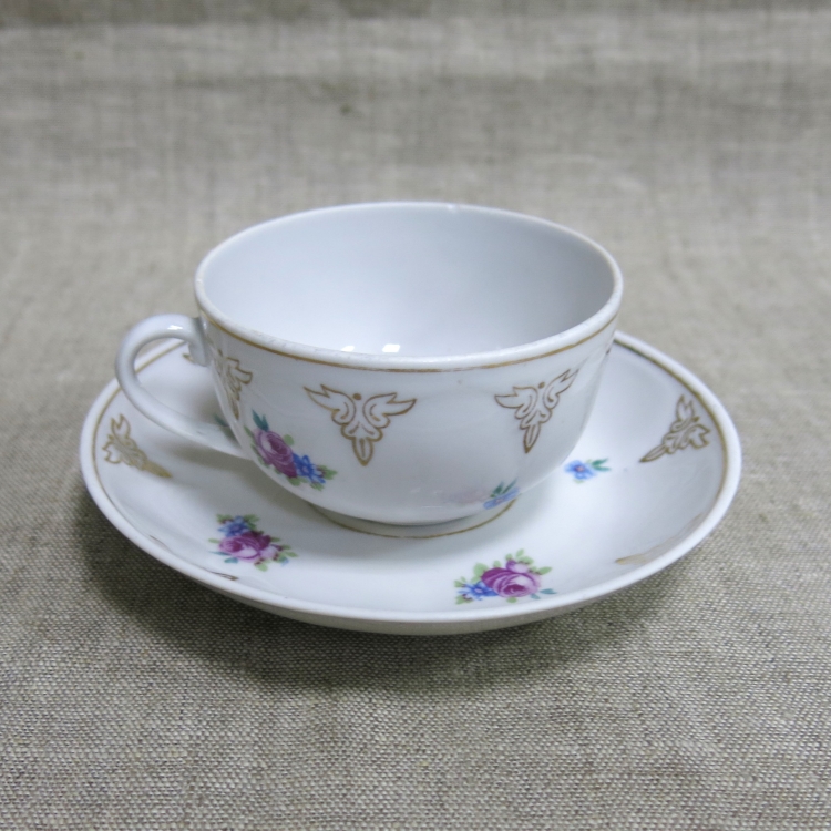 Чашка: высота - 5 см, диаметр - 8,5 см, блюдце: диаметр - 14,2 см