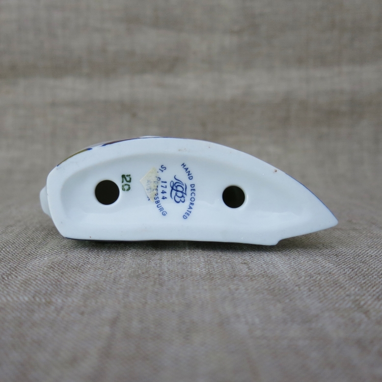 На дне синее надглазурное клеймо «Hand Decorated ЛФЗ 1744 St.Petersburg Russia» (Декорировано вручную Ломоносовский фарфоровый завод Санкт-Петербург Россия) и зелёное клеймо сортности «2С».
