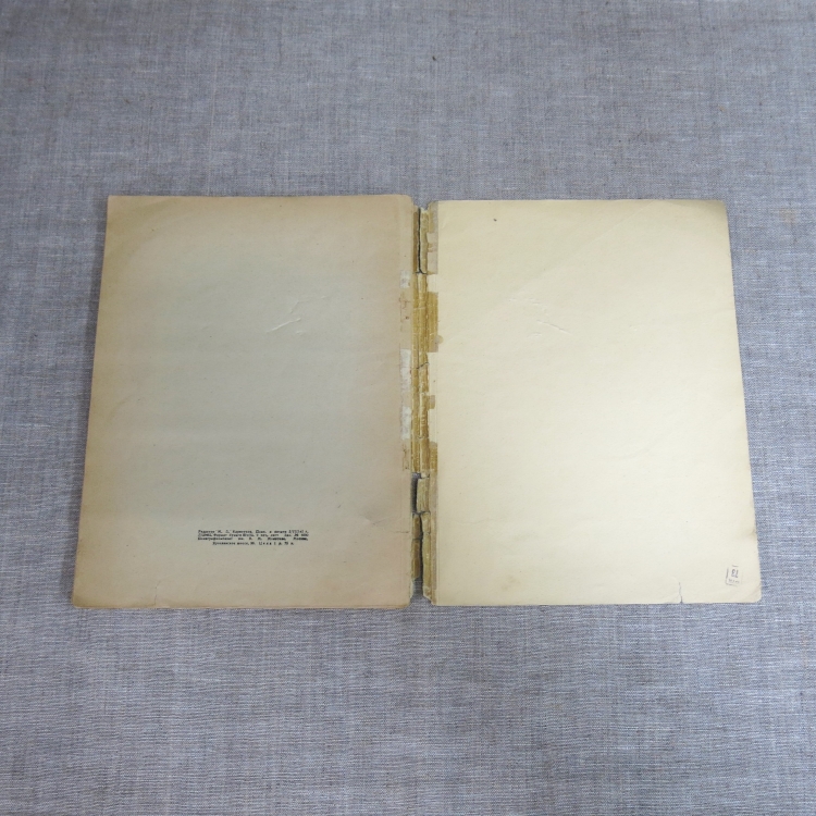 Состояние хорошее. Обложка с повреждениями и загрязнениями. Альбом разобран на листы для копирования, скрепки отсутствуют. На обложке и титульном листе владельческая подпись. На листах надрывы, загрязнения.