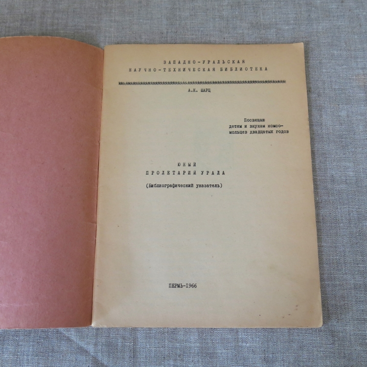 ШАРЦ А.К. ЮНЫЙ ПРОЛЕТАРИЙ УРАЛА 1918-1924 (Библиографический указатель). Пермь, 1966. Ротапринтное издание