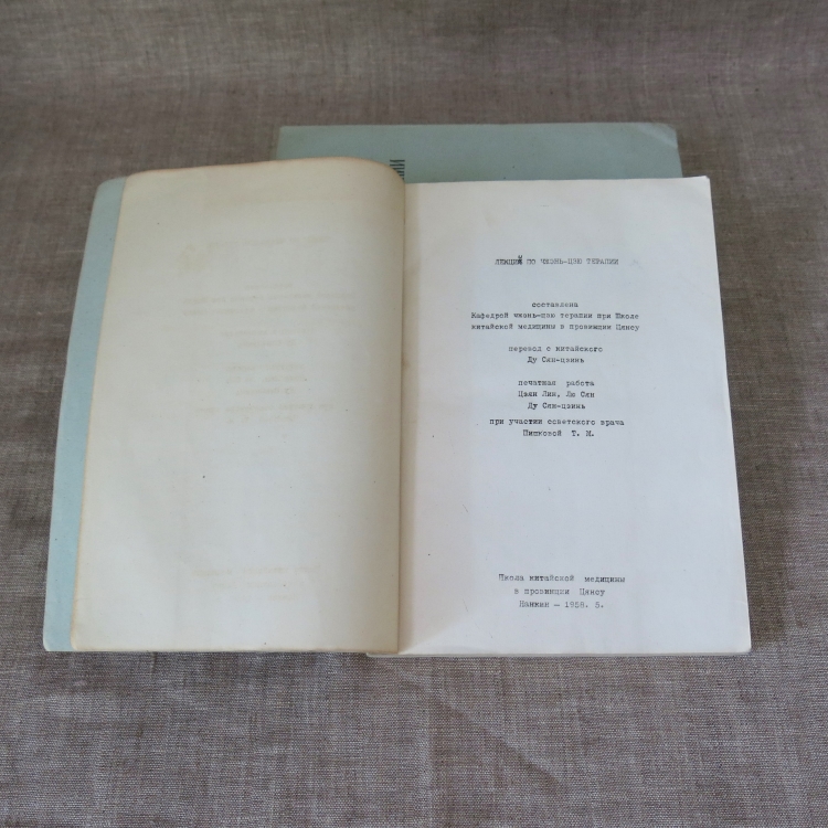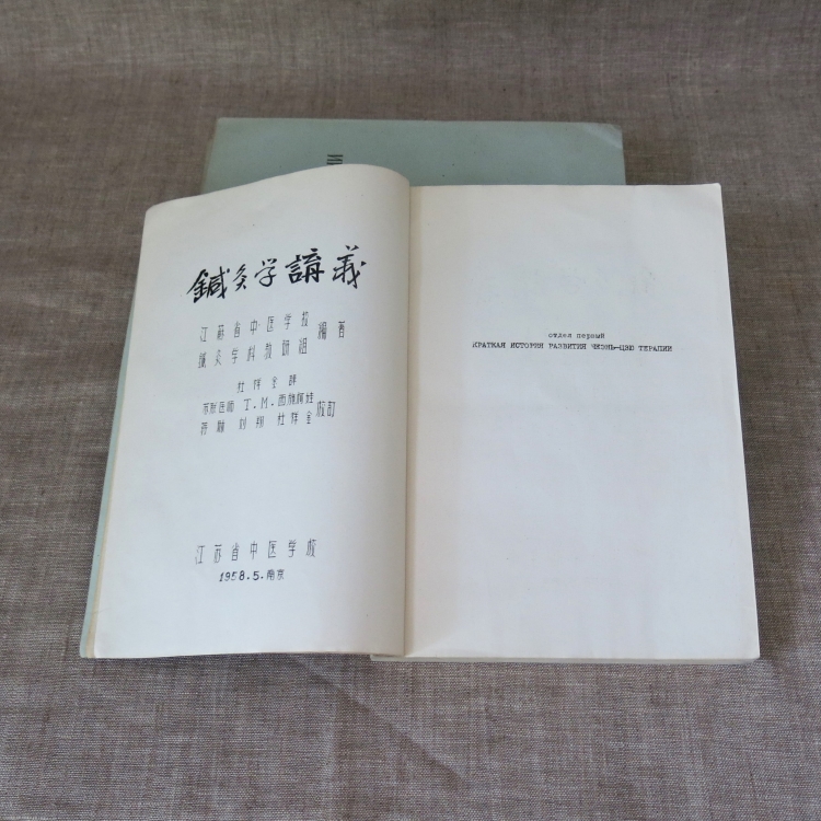 Лекции по чжэнь-цзю терапии. Составлены Кафедрой чжэнь-цзю терапии при Школе китайской медицины в провинции Цянсу. Перевод с китайского Ду Сян-цзинь. Печатная работа Цзян Лин, Лю Сян, Ду Сян-цзинь. При участии советского врача Шишковой Т.М. Издание Школы китайской медицины в провинции Цянсу, Нанкин, 1958 год. Ротапринтное издание.
