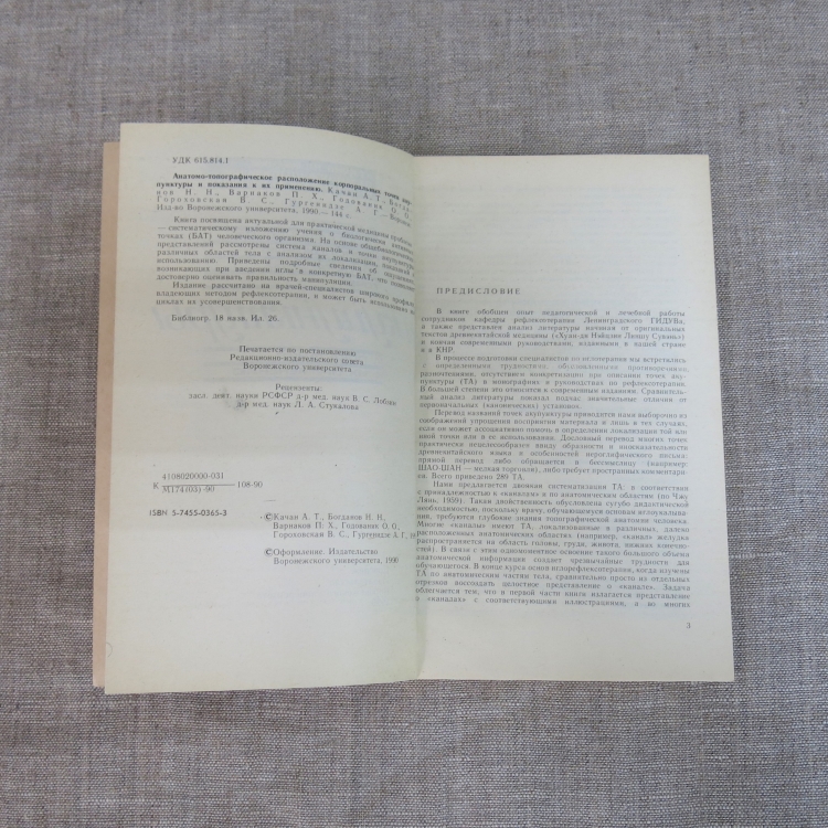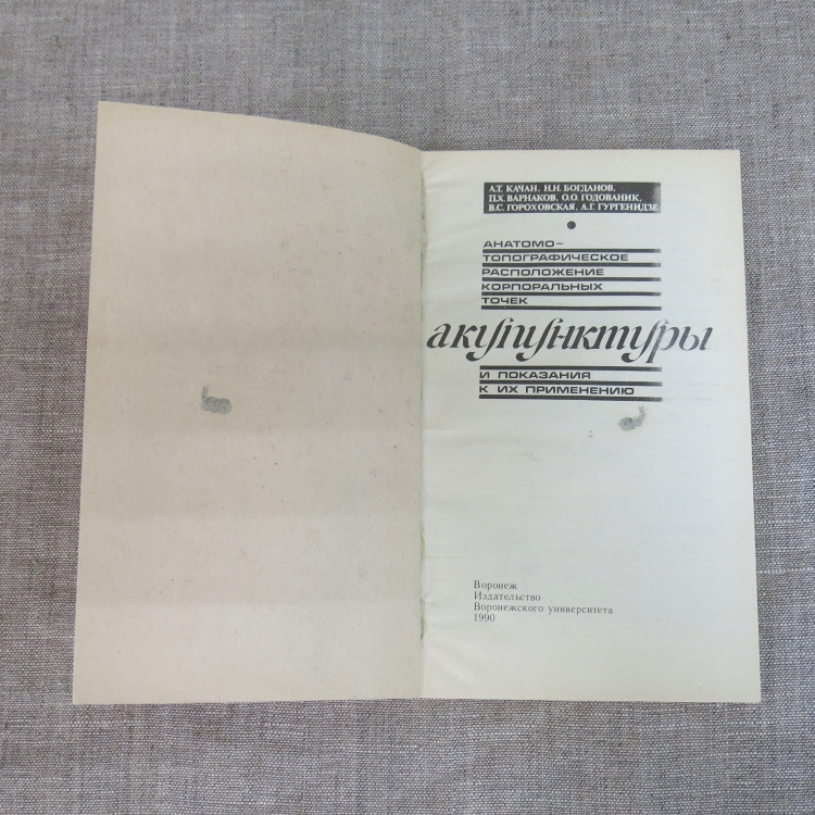 Анатомо-топографическое расположение корпоральных точек акупунктуры и показания к их применению / А. Т. Качан, Н. Н. Богданов, П. Х. Варнаков, О. О. Годованик, В. С. Гороховская, А. Г. Гургенидзе. - Воронеж : Изд-во Воронеж. ун-та, 1990. - 127 с. : ил. Тираж 100.000 экз.