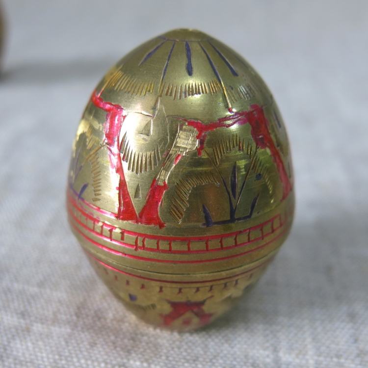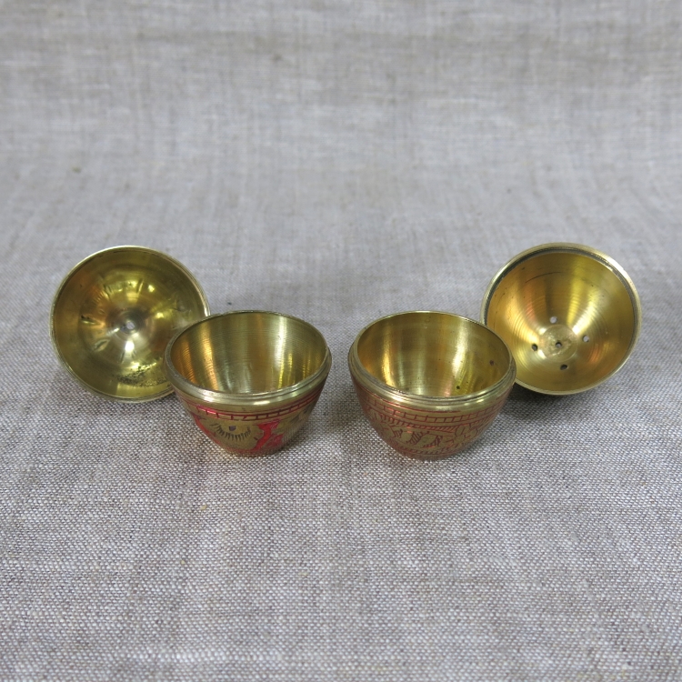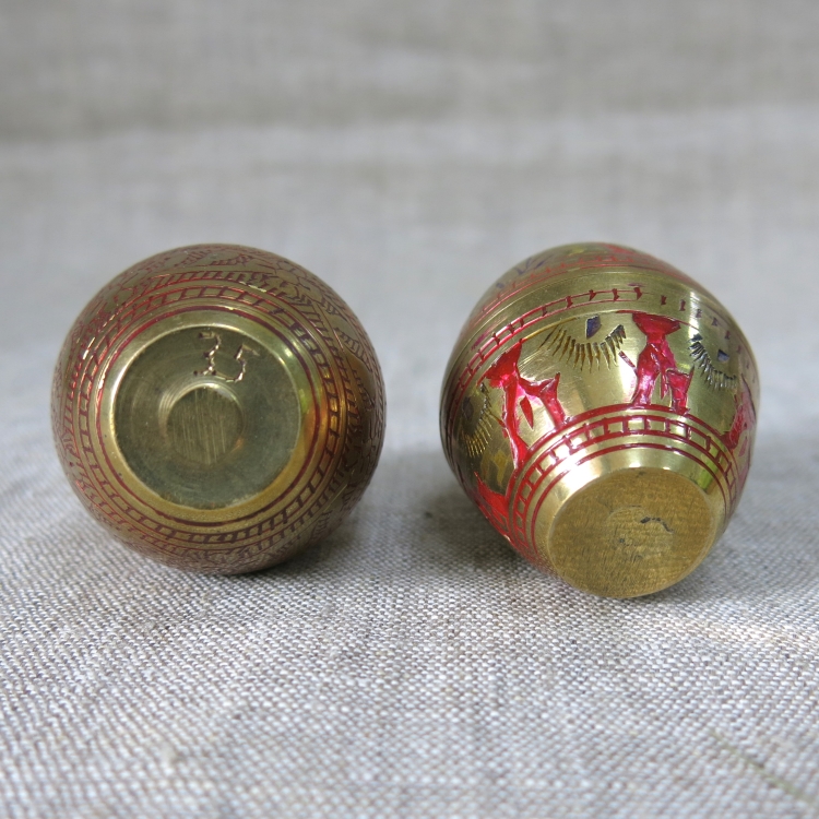 Латунные сосуды в виде яйца для соли и перца с отверстиями на макушках. Верхняя и нижняя части соединяются резьбой. Ручная гравировка штихелем, эмаль.