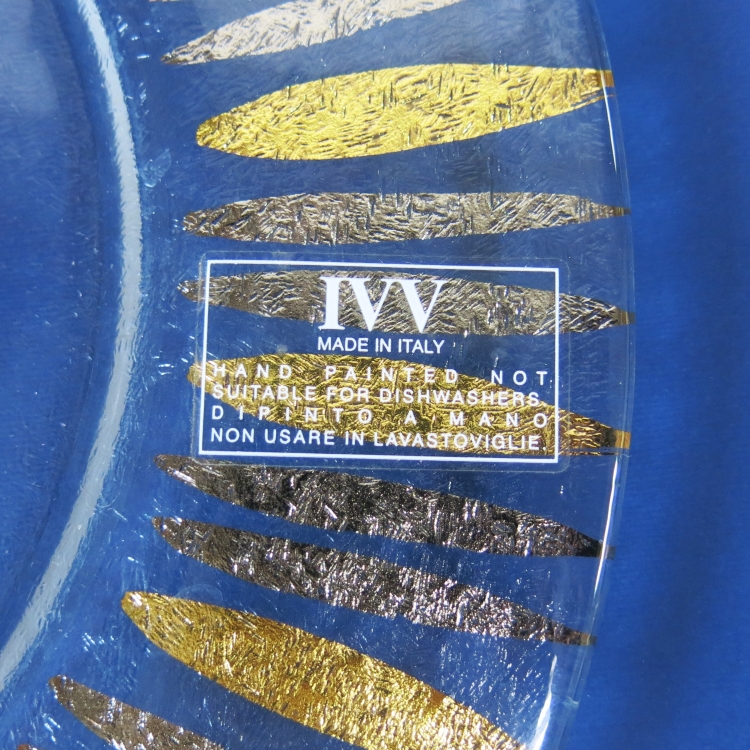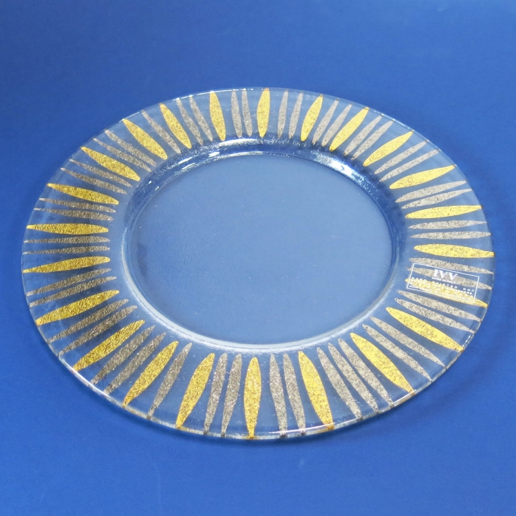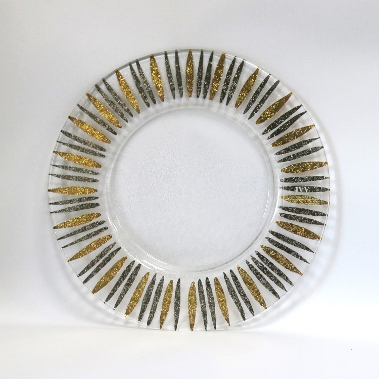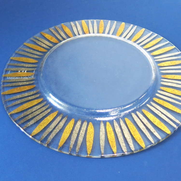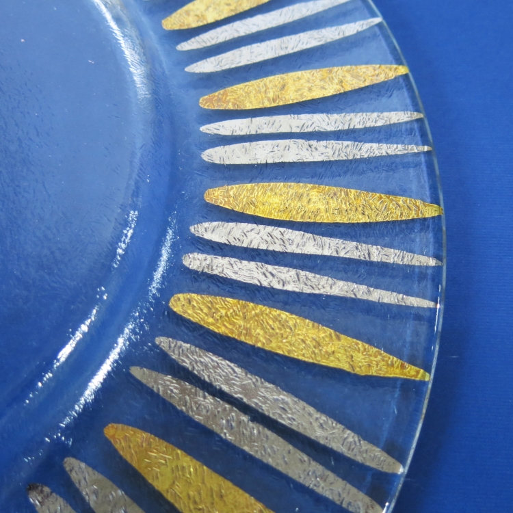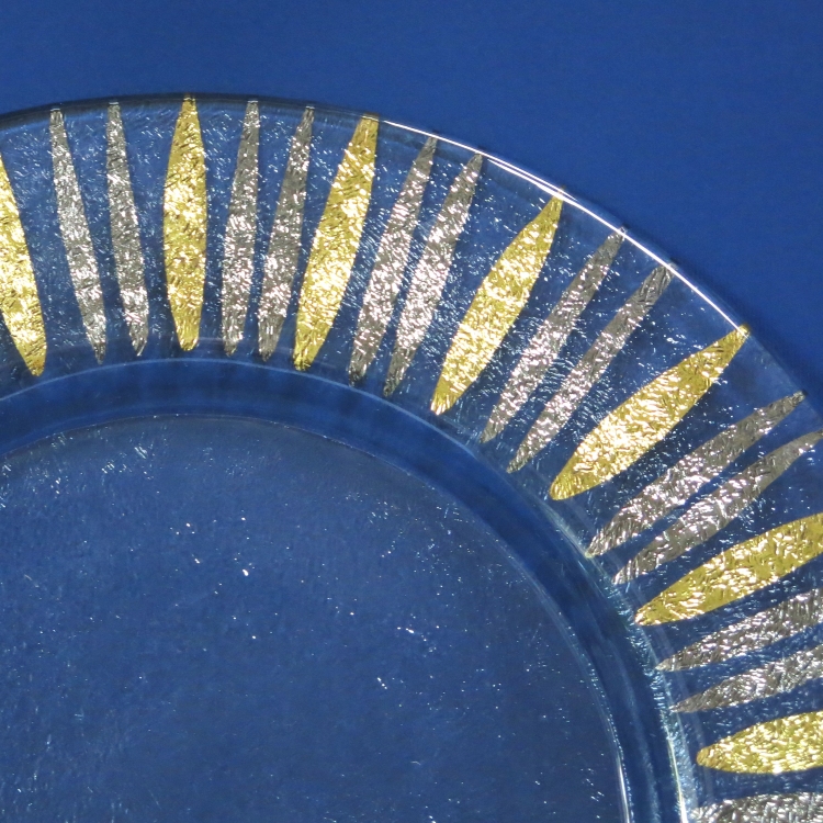 Блюдо выполнено вручную из экологически чистого стекла, изготовленного из смеси отборного песка, исключающего оксиды свинца, тяжелые минералы и летучие загрязняющие вещества. По краю декорировано орнаментом в виде золотистых и серебристых лепестков-лучей.