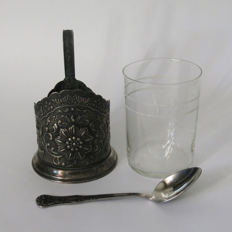 1. Подстаканник: латунь; высота без ручки - 8,5 см, высота с ручкой - 11,5 см, диаметр - 7 см, вес - 110 г. На клейме выбиты буквы «ЛЭ» в овале (завод «Ленэмальер»), 1960-70-е гг.