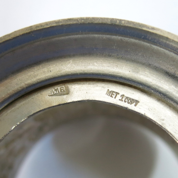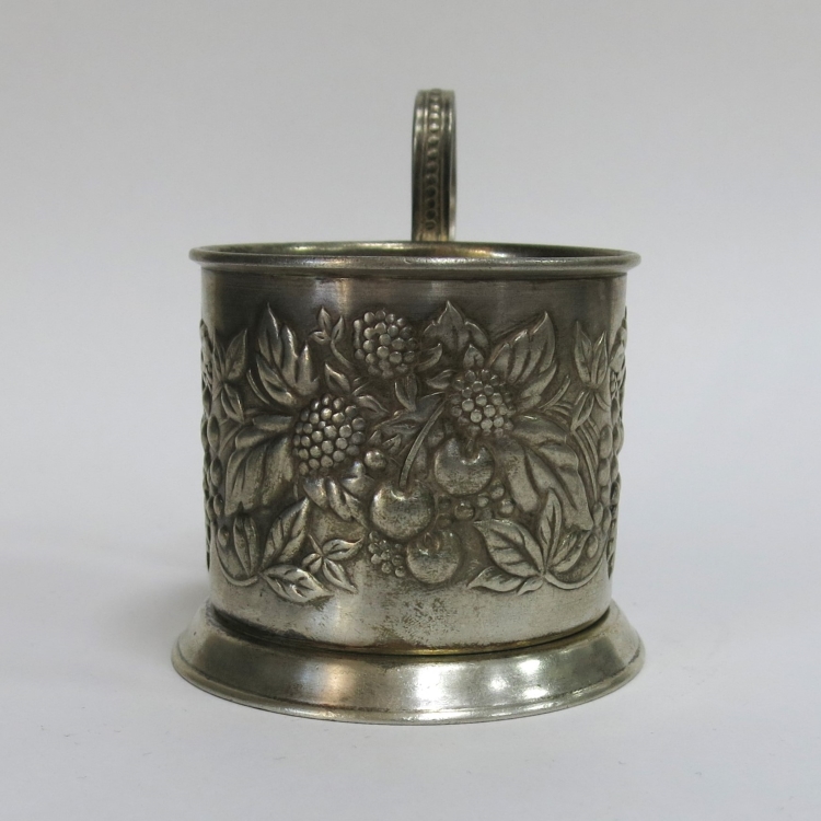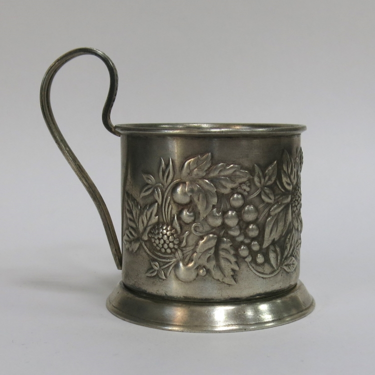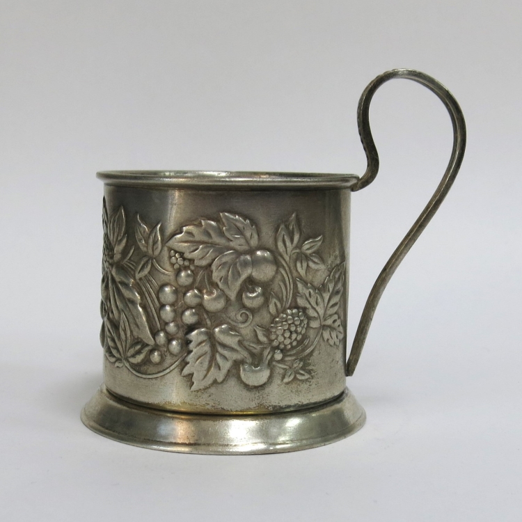 1. Подстаканник: латунь; высота без ручки - 7 см, высота с ручкой - 10 см, диаметр - 7 см, вес - 146 г. На дне подстаканника клеймо «ММ6» и «МЕТ1сорт» (Мстерская Артель им. В.М.Молотова). Год клеймения 1956. Буквы «МЕТ» означают, что изделие сделано не из драг.металла. Небольшая замятость на основании подстаканника.