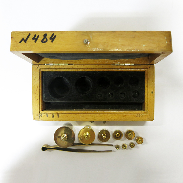 Полный комплект разновесов состоит из девяти гирь весом 100, 50, 20, 10, 10, 5, 2, 2 и 1 грамм.
